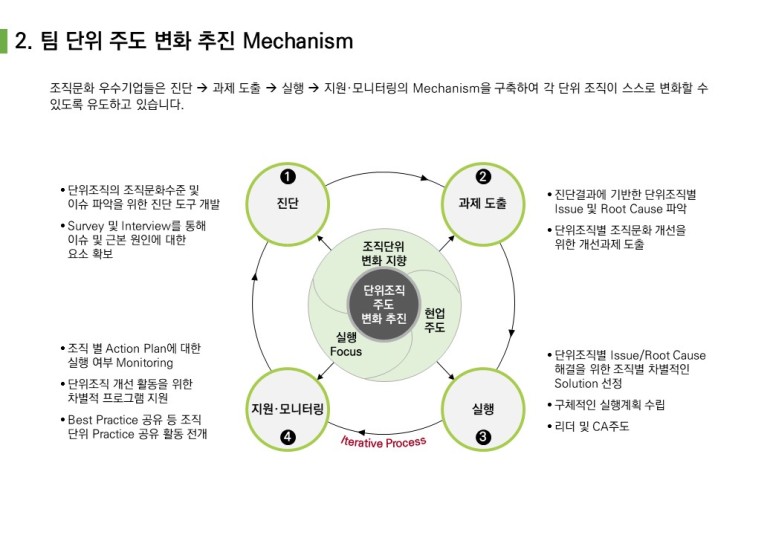 팀 단위 변화 추진 메카니즘은 런투컨설팅의 『팀 단위 조직개발 프로그램』에서 잘 정리해 주고 있으니 참고하기 바랍니다.